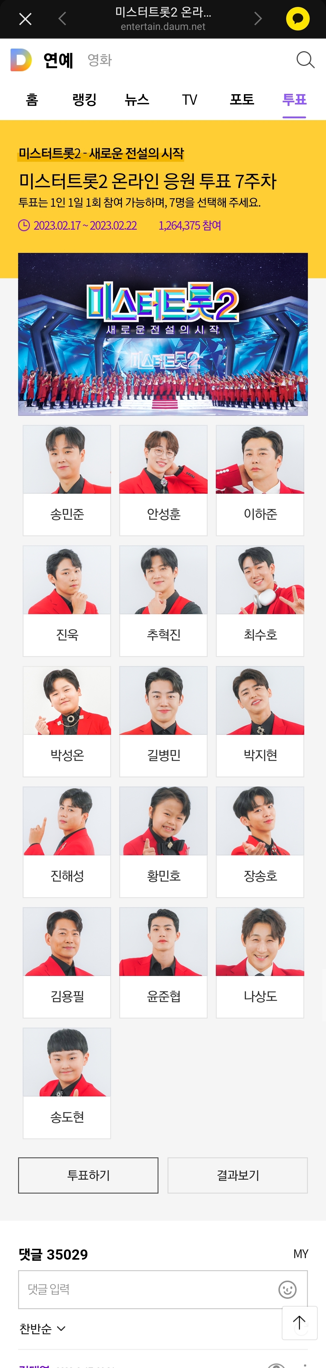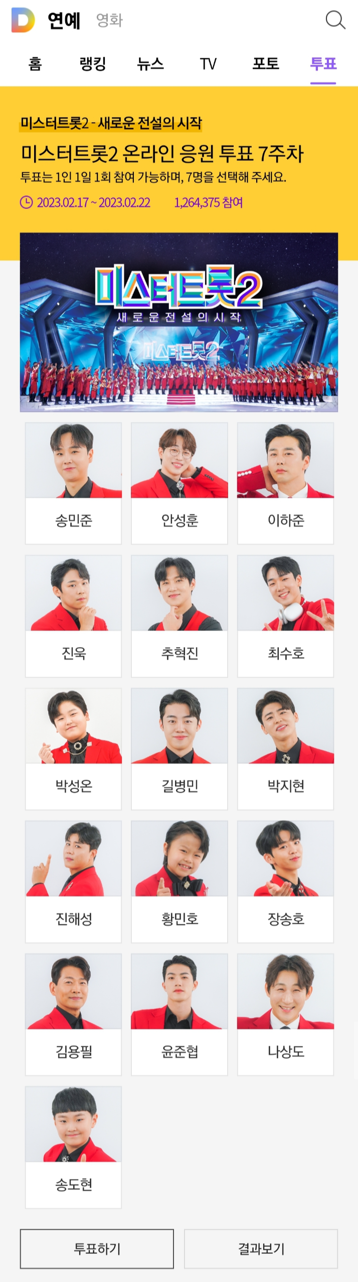 사진 설명은 아래 있습니다1. "다음" 앱 접속 2. "로그인" 확인 3. 눌러서 "로그인" 4. 검색창에 "미스터트롯2" 검색 5. "미스터트롯2" 배너 터치 6. 7명의 "미스터트롯" 을 선택 후 "투표하기" 터치 7. 투표는 1인 1일 1회 참여 가능하며, 1회에 7인을 선택 할 수 있습니다 '방송 연예' 카테고리의 다른 글