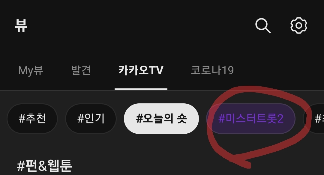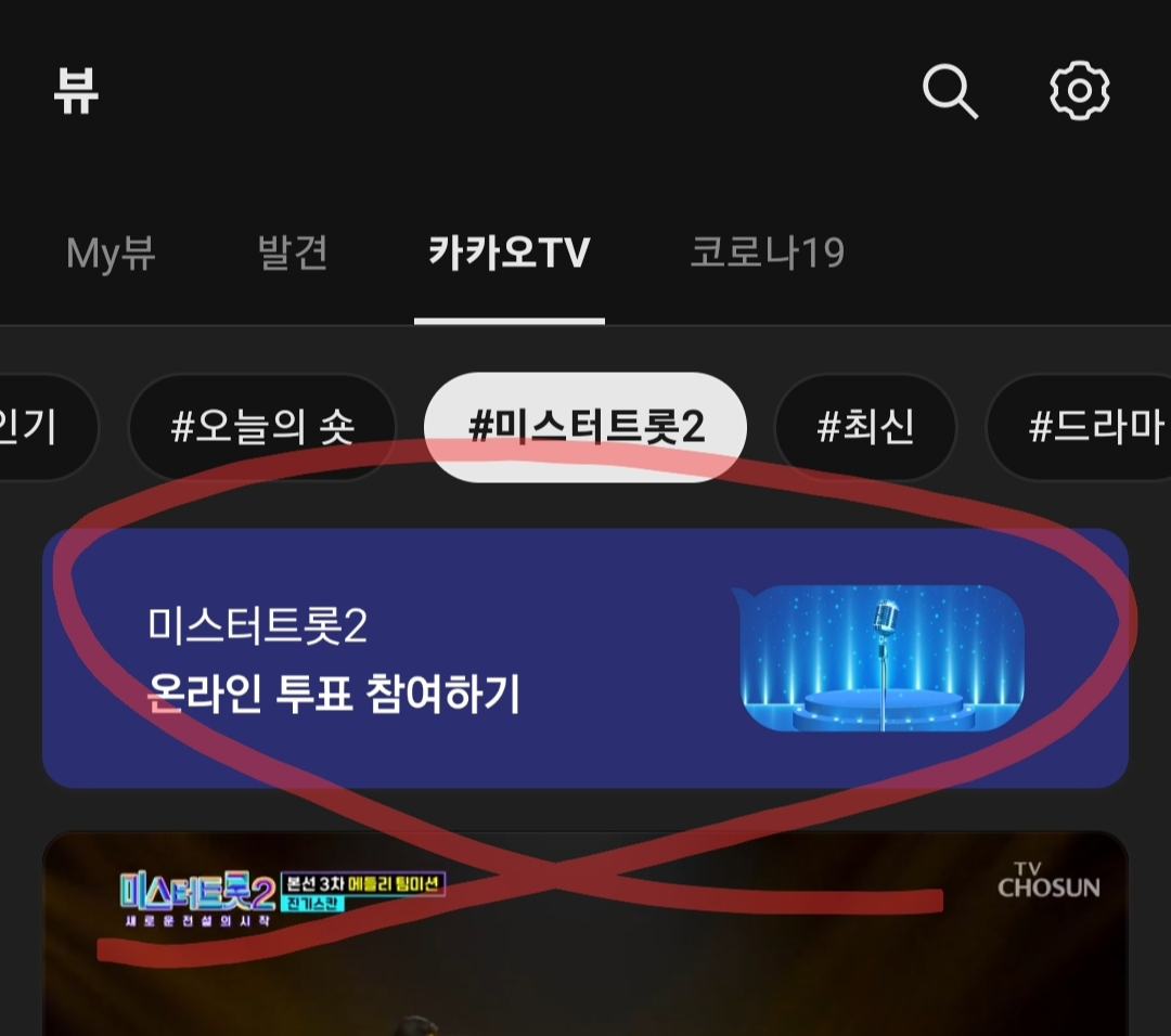 4. 상단 메뉴에서 "#미스터트롯2" 터치